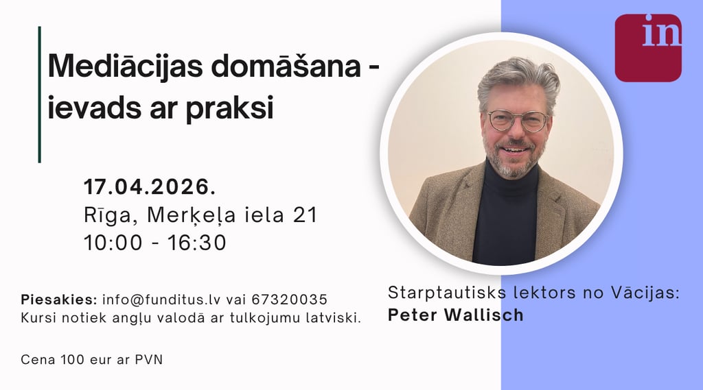 Šis intensīvais vienas dienas seminārs sniegs praktisku ieskatu mediācijā un iemācīs tehnikas, kuras vari izmantot jau nākamajā dienā - darbā, sarunās un ikdienas situācijās.